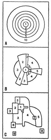 Fig. 11. Trei tipuri de zonare urbana. 1. C.B.D.; 2. Mica industrie; 3. Zona