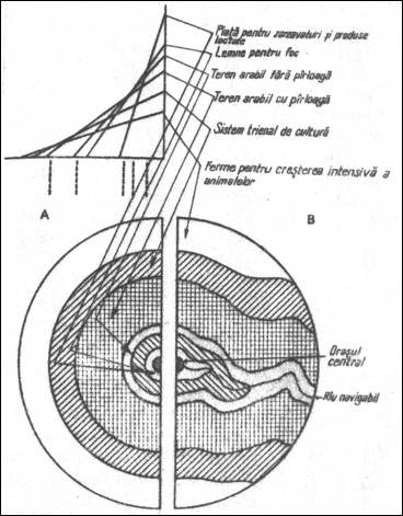 Fig. 12. Modelul von Thnen. A. Varianta "clasica"; B. Varianta ulterioara, prin introducerea unui element de anizotropie (raul). Sursa: N. Raboca, V. Surd (1989)