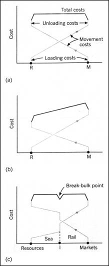 Sa presupunem ca o resursa este disponibila in punctul R si o piata de desfacere pentru aceasta resursa este localizata in orasul M. Presupunem, mai departe, ca pretul transportului creste direct proportional cu distanta si ca toate celelalte costuri (forta de munca, energie, impozite etc.) sunt egale peste tot. In situatia (a), daca costurile de incarcare/descarcare sunt aceleasi, iar costul transportului ramane constant, atunci costul minim se obtine amplasand industria de procesare fie langa locul de extractie a resursei, fie la locul de desfacere. Orice alta posibila locatie pe linia ce uneste cele doua puncte (R-M) ar conduce la o marire a costurilor, intrucat este necesara o dubla incarcare/descarcare a materialului.