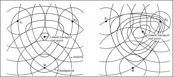 Daca insa costul transportului difera in functie de materia prima transportata, atunci izotimele din jurul fiecarui punct considerat variaza. In situatia (b), costurile de transport ale materiei prime din R2 sunt duble fata de celelalte doua puncte considerate. Acest fapt distorsioneaza izodapanele si determina o localizare optima situata mai aproape de punctul R2.