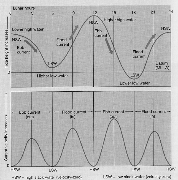 Conform modelului ideal, majoritatea zonelor de pe Pamant ar trebui sa aiba doua fluxuri si doua refluxuri de inaltimi diferite, in timpul unei zile lunare. Dar din cauza modificarii diferitelor adancimi, marimi si forme ale bazinelor oceanice, mareele in multe parti ale lumii manifeste diferite modele. Cele trei modele sunt: diurne, semidiurne si mixt. Acestea sunt sunt prezentate inn figura 1-15.
