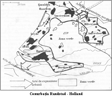 Regiunea Vestica. Conurbatia Randstad - Holland (peste 5,9 mil. loc.) se prezinta sub forma unui inel incomplet, desfasurat intre gurile Rhinului si vechiul golf Zuidersee.