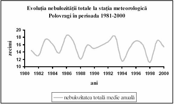 Pentru statia Polovragi, se observa ca anii in care s-au inregistrat valori scazute ale nebulozitatii alterneaza cu anii in care valorile acestui parametru sunt ridicate, fiind in directa legatura cu regimul temperaturilor medii anuale si cu cel al precipitatiilor.