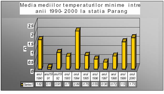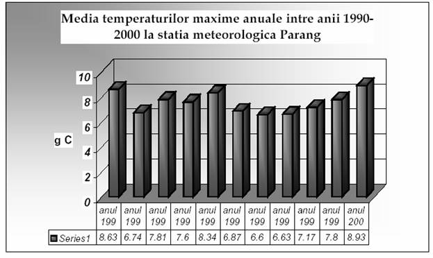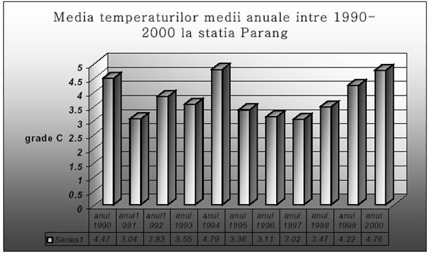 Temperatura. La statia meteorologica Parang, temperatura medie a lunii ianuarie este de -70C, iar a lunii iulie de +120C, la aceeasi altitudine medie. In perioada celor 10 ani pentru zona montana, temperaturile medii anuale cele mai ridicate oscileaza intre 4,790 si 4,760C si corespund anilor 1994 si 2000. Cele mai scazute medii anuale au fost inregistrate in anul 1997 (3,02C).