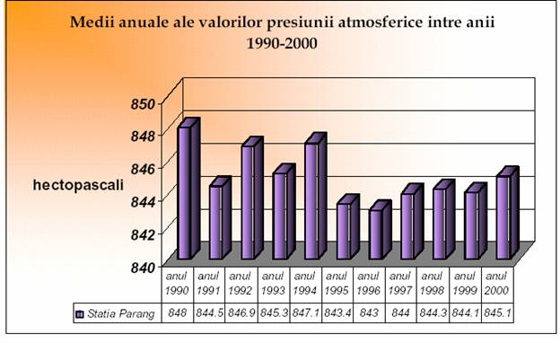 Presiunea atmosferica cuprinde valori intre 840 si 850 hectopascali, cu un maxim de 848 hectopascali in anul 1990 (statia Parang).
