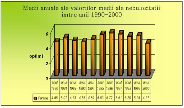Nebulozitatea La statia Parang, valorile medii anuale cele mai mari ale nebulozitatii sunt relativ constante pe perioada celor 10 ani, cea mai mare valoare apartinand anului 1996 ( 5,72).