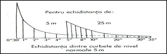 Ajuta la determinarea valorilor pantelor de pe harta cu ajutorul unui compas si fara alte calcule preliminarii. Prezinta atat graficul pentru curbele de nivel principale cat si pentru cele normale (fig. 6).