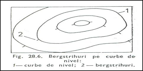 Indicatoarele de panta - Sunt liniute scurte, perpendiculare pe curbele de nivel inchise si care indica daca forma respectiva de relief este pozitiva sau negativa (fig. 10).