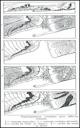 - liniar ( sepia) - reda curbele de nivel si valorile lor, indicele de panta, semnele conventionale si inscriptiile referitoare la relief;