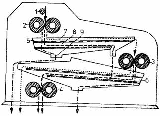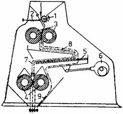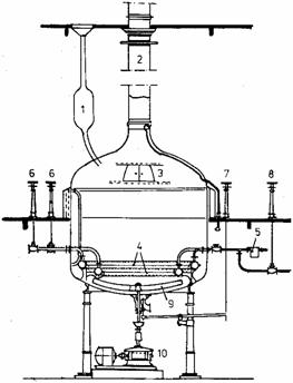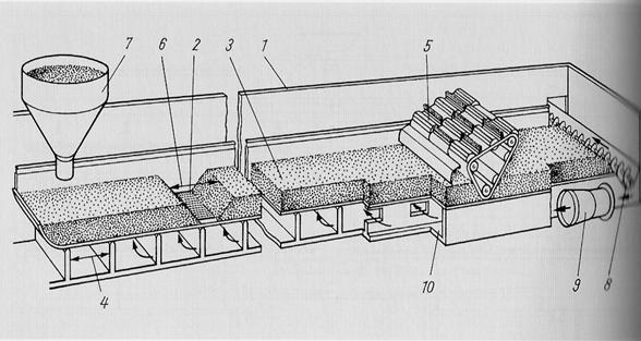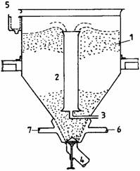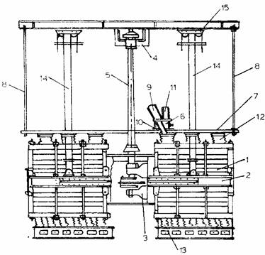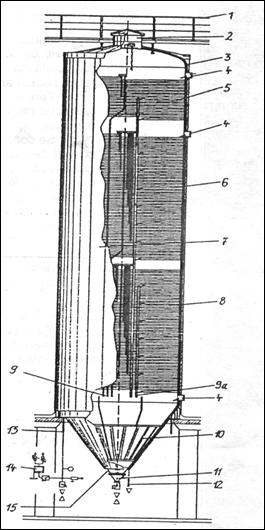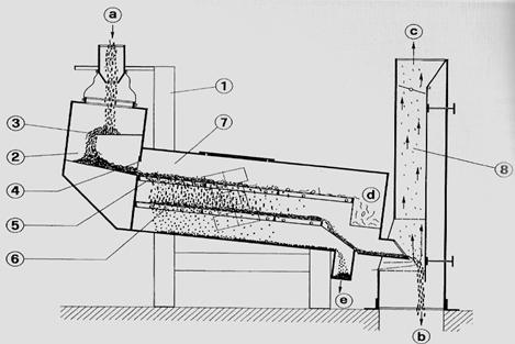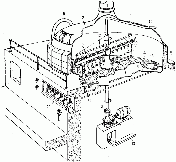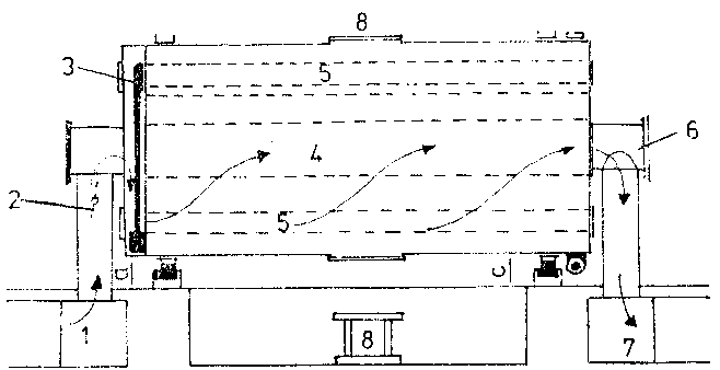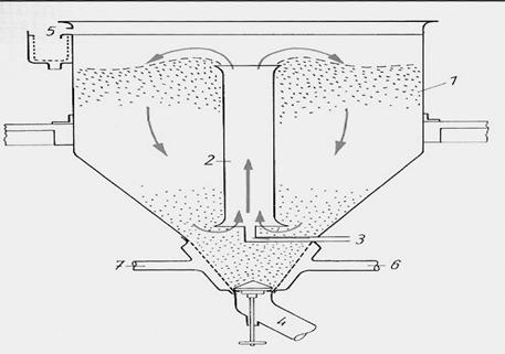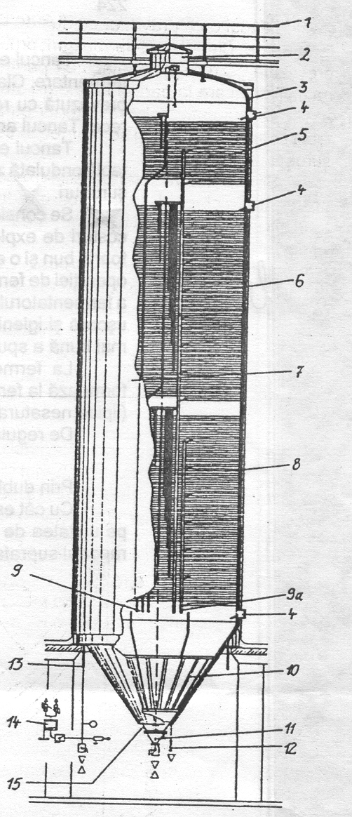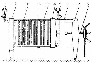 1 - placa; 2- tabla perforata; 3 - lumanare; 4 - recipient anexa; 5 - carucior - colector de namol; 6 - partea inferioara a filtrului; 7 - dozator; 8 - pompa.