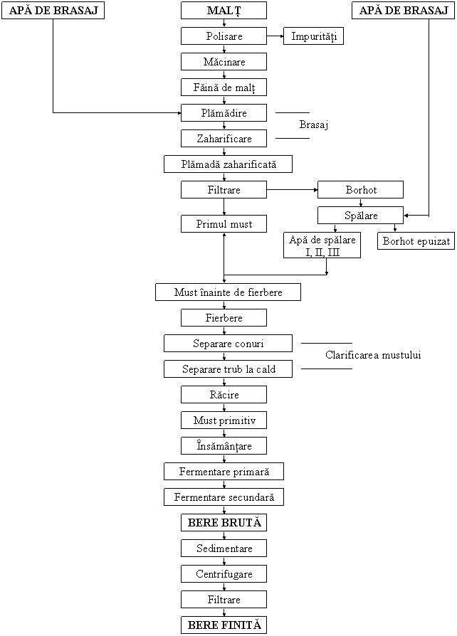 Obtinerea berii din materiile prime prezentate mai sus, in cele doua etape principale - obtinerea mustului de bere si fermentarea acestuia.