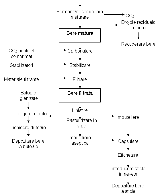 Dupa terminarea fermentatiei secundare, a carei durata depinde de sortimentul de bere respectiv, berea este trecuta la filtrare pentru indepartarea drojdiei si a altor substante care formeaza tulbureala acesteia. Berea filtrata este trecuta in tancuri speciale de bere filtrata care alimenteaza masinile de imbuteliat sau aparatul de tragere a berii in butoi. Ambalajele folosite - sticlele si butoaiele - sunt supuse in prealabil unor operatii de conditionare pentru a nu transmite un gust strain si a nu periclita stabilitatea berii. Unele sortimente de bere sunt pasteurizate la sticla, inainte de etichetare pentru prelungirea conservabilitatii. Astfel incat sticlele puse in navete cat si butoaiele pline cu bere sunt depozitate in spatii speciale racite pana la expeditie.
