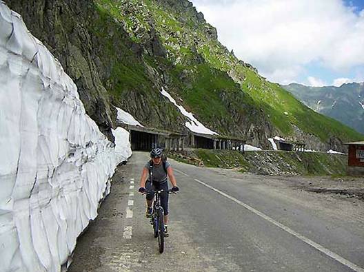Apare si zapada, mici blocuri compacte pe marginea soselei, atat a mai ramas din iarna. Prezenta unor 'iceberg-uri' in peisajul de un verde-smarald, ne mai racoreste si ne aduce aminte de aceleasi creste, de zapezi proaspete si coborari impetuoase. Si pe nesimtite ajungem la tunel, scot frontala si intram in maruntaiele umede ale muntelui, urmariti de vuietul permanent creat de masinile care trec din ambele sensuri. Nu a fost o experienta prea placuta, as fi preferat sa trecem creasta, dar asa, ne concentram la propriu pe luminita din cealalta parte si iesim rapid din tunel.