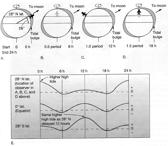 De la A la D; secvente ce arata o maree vazuta la 28s latitudine nordica cand declinatia lunii este de 28s spre nord. E - Curbe ale mareei pentru 28s nord, 0s, si 28s sud, in timpul zilei lunare arata in seventa de mai sus. Curbele arata ca cel mai mare flux se petrece la 28s latitudine nordica defazat cu 12 ore fata e cel de la 28s latitudine sudica. Toate curbele sunt pentru aceeasi longitudine.