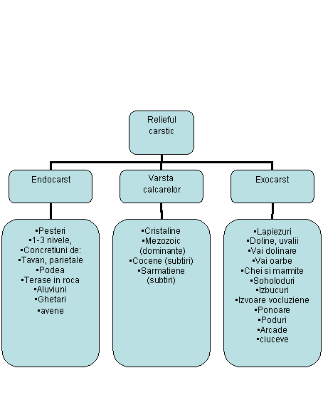 La noi in tara calcarele, care reprezinta roca tipic carsificabila, ocupa cam 2% din teritoriu. Nu apar insa sub forma unor unitati teritoriale mari, ci fragmentat. Datorita acestui fapt, si conditiile locale de carstificare, in special modul de circulatie al apei, sunt foarte diferite de la un loc la altul ; ca urmare, s-a diversificat mult si relieful carstic din Romania. Acesta este localizat cu precadere in Carpati si in unele podisuri. Cea mai mare suprefata este intalnita in Banat, peste 780 km patrati. Pentru a exemplifica varietatea acestui relief amintim ca exista peste 10.000 de pesteri care depasesc lungimea de 10m, cu peste 800 km de galerii.