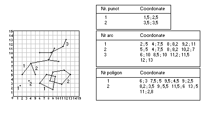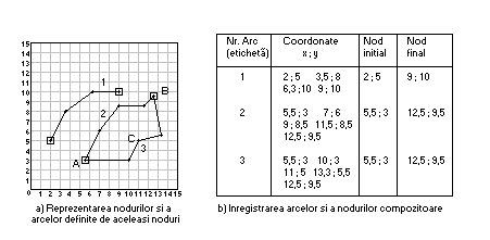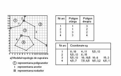 Aparitia suprafetei induce doua asociatii suplimentare: un arc are obligatoriu un singur poligon la stanga si un singur poligon la dreapta. Invers, un poligon este situat, fie la stanga, fie la dreapta unui arc sau a mai multor arce. In fine, graful acestui model este obligatoriu planar. In figura 8 avem un caz posibil de harta vectoriala in codificarea topologica de suprafata. Nodurile nu au fost numerotate deoarece, in acest caz nu mai este necesar.