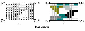 In figura 9 avem o harta raster in care pixelii sunt reprezentati prin numere. Aceste numere care, in fond le corespund anumite caracteristici cantitative de pe suprafata Pamantului, se convertesc la o afisare pe un monitor, in culori. Aceasta este asa-numita reprezentare logica a hartii. Asa cum am amintit mai sus, un pixel este definit de un numar de linie si un numar de coloana. Spre deosebire de modelele vector in care originea este in stanga jos, aici originea este in stanga sus (0,0). In figura 10 avem o matrice de celule de 8 linii x 13 coloane. Aceasta se materializeaza printr-un fisier care va contine numerele respective. Numaratoarea celulelor merge de la stanga la dreapta si de sus in jos. Inregistrarea fizica a imaginii este o singura coloana lunga de numere formata, in cazul nostru: 0,0,0,1,1,1,2,1,1,0,0,1,1,3,3,3,1,3,3,2,2 Aceste numere pot fi reprezentate intern prin bytes, numere intregi sau numere reale.
