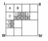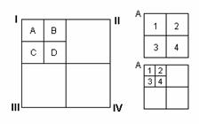 O alta metoda mai eficienta de stocare a datelor raster este cea bazata pe structura ierarhica cunoscuta sub numele de quad-tree. Principiul este urmatorul: imaginea este impartita in patru, rezultand patru dreptunghiuri sau patrate mai mici (pe care le vom numi quadrante), fiecare quadrant se imparte din nou in patru. Procedeul se repeta pana cand se obtin quadrante cu o structura omogena (adica au aceeasi valoare a pixelilor). Mai precis, in momentul in care un quadrant are o aceeasi valoare pe intreaga suprafata descompunerea este oprita pe acesta ramura, ea continuand pentru quadrantele care prezinta valori diferite ale pixelilor. In orice caz procesul se opreste la nivel de pixel (Figura 11). Am ales pentru exemplificare o reprezentare booleana adica 1 si 0 (1 pentru negru si 0 pentru fond), asa cum este infatisata in figura 12. Structura arborelui este data in figura 13. Pentru imagini cu valori diferite ale pixelilor, structura este similara, doar ca este mai complexa. Aceasta metoda de stocare este eficienta cand imaginea contine suprafete mari de o aceeasi valoare. Imaginea raster va fi asociata cu un tabel de pointere care localizeaza quadrantul din cadrul descompunerii si un tabel de indici care arata de cate ori a fost impartit quadrantul.
