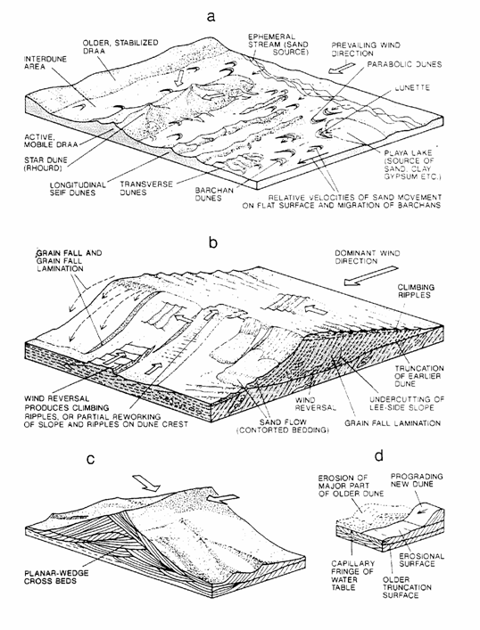 ** Stratificatia oblica la scara mare si corpurile oblic tabulare sunt foarte frecvente; unitatile planare rezulta din curenti unidirectionali prin alunecarea clastelor (grain fall) pe flancul scurt al dunei (inclinari de 28), sau prin avalanse (avalanching sand flows).