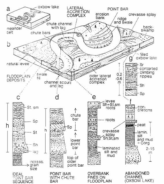 Bancuri arcuite (Point‑bar deposits): repauzeaza peste aluviunile bazale; grosimea lor este proportionala cu adancimea canalului. Granofaciesul variabil: rudite, arenite si silt‑uri, slab sortate; variatiile de debit determina interstratificatia sedimentelor fine cu cele grosiere; secvente fining‑up; au stratificatie oblica la scara mare cu inclinari reduse, spre aval. Este o unitate de acretie laterala.