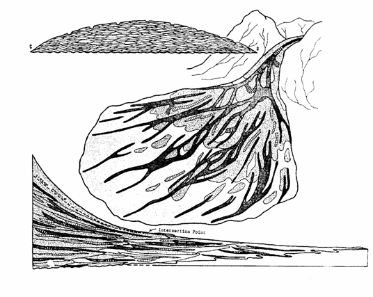 - blocuri angulare amestecate cu pietrisuri, prinse intr‑o matrice argiloasa in corpuri lobate, levee sau corpuri linguoide (spre apexul conului);