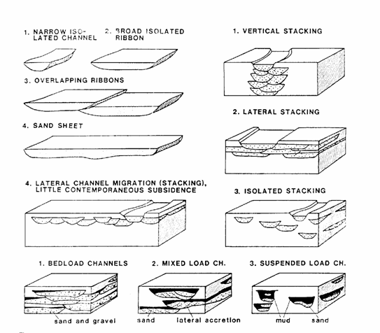 Fig. Principalele geometrii ale rezervoarelor, formate in sistemul fluviatil (dup_ Galloway, 1985). |