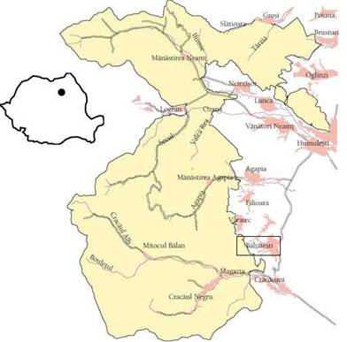 rasfirandu-se apoi pe vaile paraielor ce o strabat; se intinde pe pantele in terase ale dealurilor (de la sud spre vest): Dealul Osoi (526 m); Vf. Pietricica Baltatesti (661 m); Padurea Mare (706 m); Dealul Bolovanu (592 m); Dealul Carpenului (606 m); Dealul Buga (404 m); Dealul Maga (465 m).