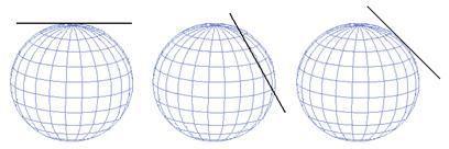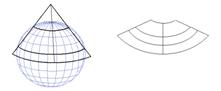 (b) Proiectia conica cea mai simpla se obtine cand suprafata conica este tangenta la sfera (figura 6). Paralela la care conul este tangent se numeste paralela de referinta sau standard. Este exclusa situatia cand paralela standard este Ecuatorul; aceasta situatie genereaza proiectia cilindrica (vezi mai jos). Meridianele sunt convergente spre pol. Pe paralela standard nu exista deformari. Acestea apar inspre N si S. Polul nu este corect reprezentat, astfel ca, se procedeaza la selectionarea conului in vecinatatea lui. O alta varianta a proiectiei conice este atunci cand suprafata conica este secanta la suprafata Pamantului (figura 7).