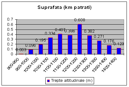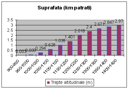 Pentru bazinul in cauza, dupa ce s-au determinat suprafetele dintre curbele de nivel succesive, s-a procedat la multiplicarea lor cu semisuma cotelor, apoi s-au insumat produsele obtinute si, in final, suma rezultata s-a impartit la suprafata bazinului. Altitudinea medie gasita este de 1203.88m