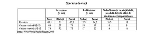 Analizele comparative cu celelalte tari europene privind speranta de viata situeaza constant Romania pe ultimele locuri, cu mentiunea ca si ritmul de crestere al sperantei de viata este nesatisfacator. Spre exemplu, cresterea sperantei de viata la femei in perioada 19701998 a fost in Romania de 3 ani, in timp ce in UE aceasta crestere a fost de aproximativ 6 ani. Speranta de viata este un indicator sintetic complex influentat nu numai de calitatea serviciilor medicale, ci si de ceilalti determinanti ai starii de sanatate.