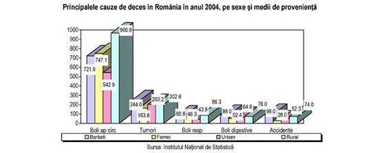 Mortalitatea prin bolile aparatului circulator reprezinta principala cauza de deces in Romania, rata acesteia crescand de la 458,1 decese la 100.000 de locuitori in 1970 la 734,8 in 2004. Comparativ cu tendinta descrescatoare din Europa, in Romania, dupa o crestere semnificativa in primii ani ai ultimului deceniu, rata scade lent ajungand la valoarea anului 1990. Principalele doua afectiuni cauzatoare de deces din cadrul bolilor cardiovasculare sunt urmatoarele: