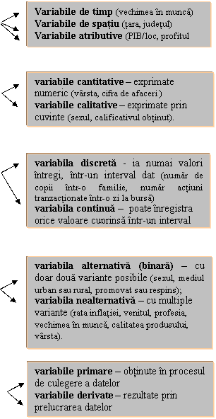 Caracteristica statistica (variabila statistica) este trasatura, proprietatea sau insusirea comuna tuturor unitatilor unei colectivitati. Caracteristicile care fac obiectul cercetarii statistice trebuie sa serveasca obiectivului cunoasterii, in sensul ca ele definesc fie trasaturi cercetate, fie factori explicativi, cauze posibile ale variatiei acestor trasaturi de la un element al colectivitatii la altul. Caracteristicile statistice se pot clasifica dupa mai multe criterii, prezentate in caseta 1.2.
