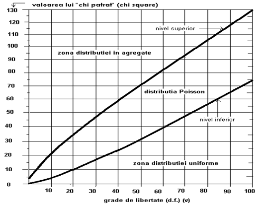 Zonele celor 3 tipuri de dispersie, ilustrate grafic pe baza relatiei dintre valorile calculate ale lui " " si (grade de libertate; n-1). P = 0,05.