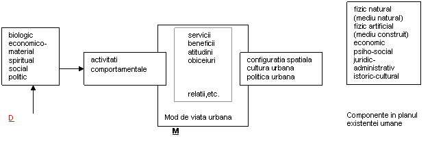 Ac. 2 planuri sunt legate intre ele cu o legatura determinanta din cea care inseamna raportul dintre determinare si componente. Avem de-a face cu determinari pe linie de interese-necesitati. Apoi det de factura biologica, materiala, spirituala, sociala, politica, etc Schema rezulta ca o concluzie. Activitatile urbane localizate definesc spatiile, iar determinarile nasc comportamente pe linia necesitatilor. Vorbim despre activitati si spatii, despre 2 sisteme, dar ele fiind 2 subsisteme de fapt al unui sistem mai amplu. Ansamblul activ urbane localizate ca viata urbana, iar ansamblul spatiilor urbane drept cadru urban.