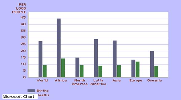 Ritmul de crestere a populatiei nu este uniform pe intreaga planeta, cunoscand de fapt mari diferentieri pe regiuni geografice. Astfel, in perioada 1980-1985, fata de valoarea medie, care a fost de 1,7%, s-au inregistrat valori mai ridicate in Africa (2,9%), America Latina (2,3%) si Asia de Sud (2,2%) si mai scazute in Oceania (1,5%), C.S.I. (1%), America de Nord (0,9%) si mai ales in Europa (0,3%). In perioada 1990-1995 indicele cresterii populatiei a inregistrat valoarea de 1,6%.