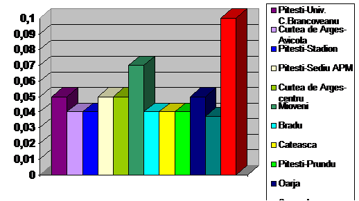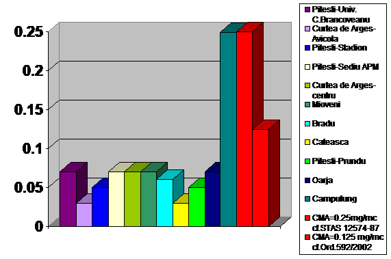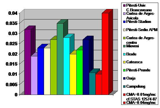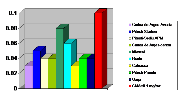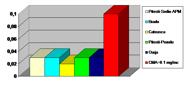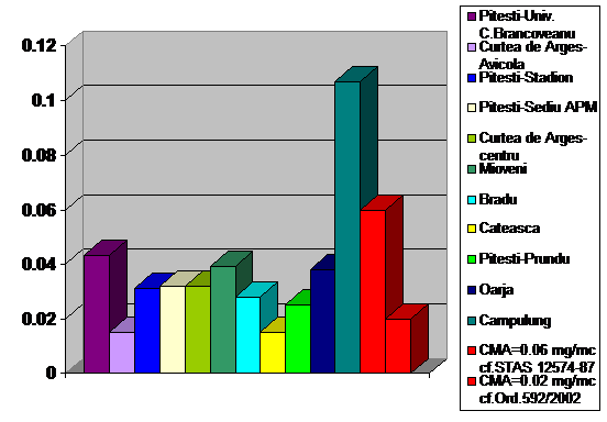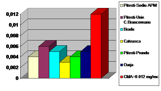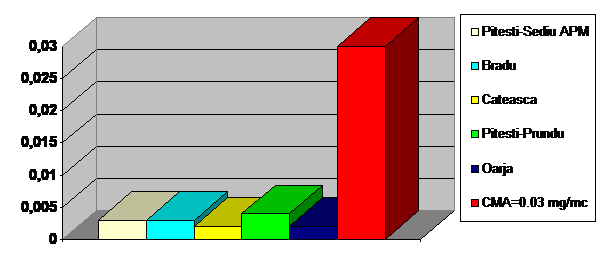 S-au inregistrat depasiri ale concentratiei maxime admise in zonele Selari si Namaiesti, in special in lunile de vara-toamna (august-septembrie). Agentul economic potential poluator pentru zona Campulung (punctele de prelevare 2-7) este SC Holcim Romania.