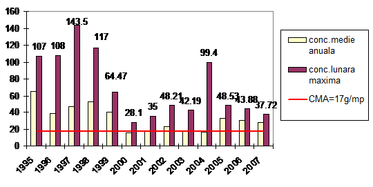 Evolutia concentratiei de pulberi sedimentabile in perioada 1995-2007