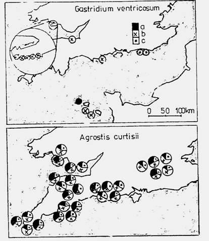 Fig. 6-38. Repartitia alelelor genei GOT in populatiile gramineelor Gastridium ventricosum si Agrostis curtisii din Marea Britanie (dupa Gray, 2000; din Cristea si Coroiu, 2002). a, b, c - reprezinta cele 3 categorii de alele.