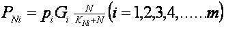 (Gi = cea mai ridicata viteza de crestere; N = concentratia nutrientilor din sol; KNi = constanta de semisaturare; PNi = probabilitatea numarului de indivizi ai speciei i).