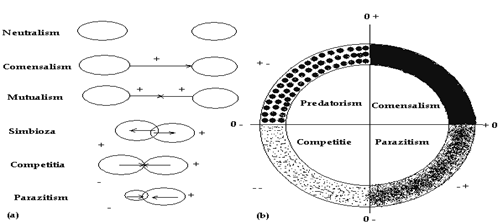 Fig. 6-130. Coordonatele modelului interactiunilor dintre 2 specii schematizand cateva tipuri comune de interrelatii; prezentare in doua modalitati (dupa Odum 1993; Faurie si colab. 1998)).