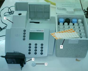 1 – fotometru; 2 – kitul cu reactivi; 3 – adaptor de tensiune; 4 – cip de memorie.