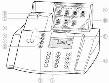 1 – dispay; 2 – tasta de intrare în meniu; 3 – tasta pentru afisarea manualului de instructiuni;4 – locas pentru cipul de memorie; 5 – tasta pentru masurarea extinctiei; 6 – tasta pentru masurarea concentratiei; 7 – teaca pentru alinierea cuvei; 8 – locas pentru introducerea cuvei cilindrice; 9 - panorama de afisare a modului de lucru (forma scurta); 10 – clapeta de pornirea/oprirea fotometrului; 11 - locas pentru introducerea cuvei rectangulare; 12 – tastatura (taste numerice, cursoare, tasta de stergere a valorilor, tasta pentru introducerea virgulei).