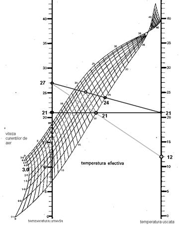 Pe baza unui numar mare de experiente in care s-a apreciat senzatia termica resimtita de diferiti subiecti expusi la diferite tipuri de microclimat conventional s-a ajuns la determinarea temperaturii efective cu ajutorul unor tabele si nomograme de temperatura efectiva in care senzatia termica se masoara in grade de temperatura efectiva. Parametrii utilizati pentru determinarea temperaturii efective sunt urmatorii : temperatura uscata si umeda si viteza curentului de aer. Cunoscand valorile temperaturii uscate si umeda (determinate cu psihrometrul Assman) se stabileste umiditatea relativa a aerului cu ajutorul unor tabele psihrometrice. Determinarea vitezei curentilor de aer se face cu ajutorul catatermometrului Hill. Utilizarea nomogramei temperaturilor efective se face in felul urmator : pe dreapta verticala din partea stanga se noteaza valoarea citita la termometrul cu rezervor uscat, iar pe verticala din partea dreapta se noteaza valoarea citita la termometrul cu rezervor umed, se unesc cele doua valori printr-o dreapta care va intersecta linia ce indica viteza curentilor de aer exprimata in m/sec. Punctul de intersectie reprezinta pe liniile transversale, gradul de temperatura efectiva.