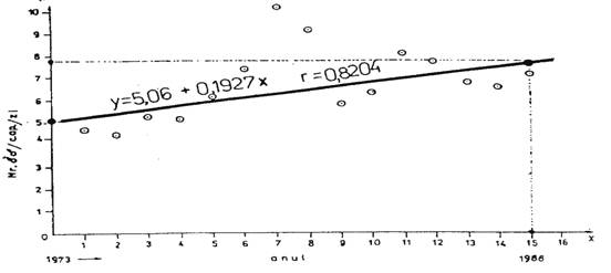 Fig. 5-37. Tendinta de evolutie a populatiei in timp. Model sugerat cu ajutorul ecuatiei si dreptei de regresie dupa datele din sampling (dupa Stan 1993).