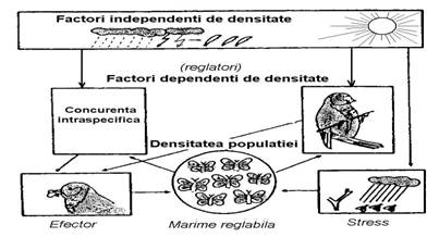 Influenta factorilor externi sau interni nu se rezuma numai la actiuni directe asupra nivelului populatiei influentand natalitatea sau mortalitate si si sub alte aspecte (frecventa indivizilor inainte si dupa reproducere, rata sexelor, starea de sanatate etc). Factorii care influenteaza dinamica populatiilor sunt asfel diversi. Unii autori ii impart in doua categorii mari: factori dependenti de densitatea populatiei si factori independenti de densitatea populatiei (Lack 1954; Stugren 1975). Sistemul cibernetic al reglarii dinamicii populatiilor. Toti factorii implicati in reglarea nivelului populatiilor isi manifesta actiunea intr-un sistem complex, integrat. Principiul feedback este caracteristic in mecanismul acesta al reglarii densitatii (Fig. 5-38).