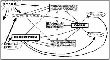 Astfel, in ecosistemul tehno-industrial omul ocupa un loc central (Fig. 7-69) iar biota apare ca ceva secundar. Accentul se pune pe diminuarea poluarii, dar tarile avansate pun accent pe participarea biotei la realizarea echilibrelor si la acest nivel (fabrici si uzine inconjurate de spatii verzi, de specii rezistente la poluare