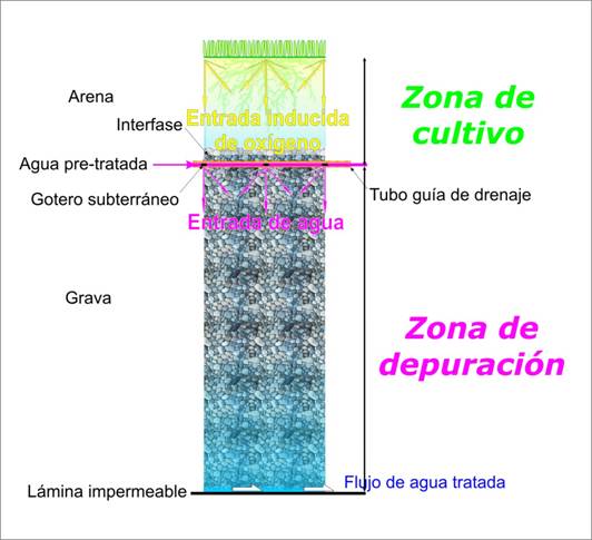Apa reziduala ajunge prin intermediul unei retele de emitatori subterani, instalati in interiorul unor conducte ranurate, deasupra pietrisului, pentru a produce percolarea apei prin acesta. Odata atinsa baza impermeabila, apa reziduala, deja epurata, se scurge, datorita gravitatiei, catre punctele de varsare, inmagazinare sau pompare, in vederea reutilizarii ei pe alte suprafete.