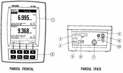 1 – afisaj cu cristale lichide (LCD); 2 – tastatura principala; 3 – conector USB; 4 – întrerupator ON/OFF pentru pornirea si închiderea instrumentului; 5 – conector pentru alimentarea cu tensiune electrica; 6 – conector port serial RS232; 7 – conector pentru sonda de conductivitate; 8 – conector pentru sonda de temperatura; 9 – conector pentru electrodul de pH; 10 – conector pentru electrodul de referinta.