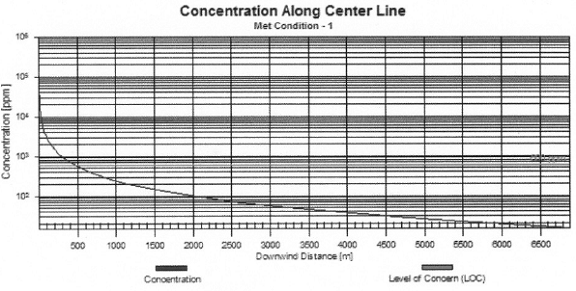 Zona afectata de concentratii letale (peste LC50) se intinde pana la cca 16 m iar pragul IDLH este atins intr-o zona cu raza cercului de 364 m.