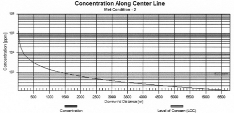 In graficul urmator se prezinta evolutia concentratiei triclorurii de fosfor in aer functie de distanta de sursa de emisie iar zonele afectate sunt prezentate grafic in Anexa IVBIII 1a.